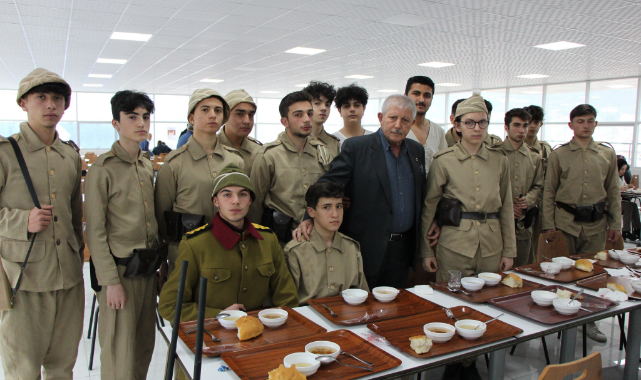 Belediye Başkanı Sarı’nın misafiri olarak o dönemin asker üniformasıyla yemeğe gelen lise öğrencilerinden 16 yaşındaki Enes Malik Kaya ise, “Daha önce Çanakkale menüsünden yememiştim. Ruhları şad olsun” ifadelerini kullandı.