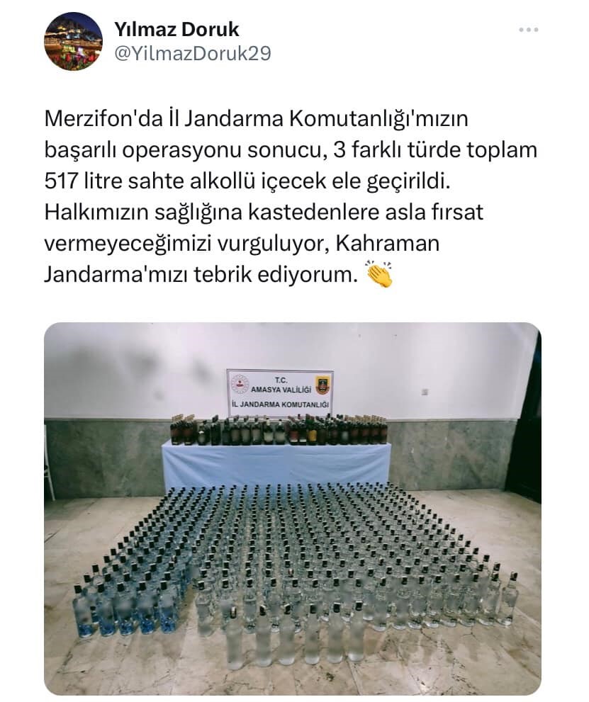 Amasya Valisi Yılmaz Doruk başarılı operasyona ilişkin yaptığı paylaşımda, “Halkımızın sağlığına kast edenlere asla fırsat vermeyeceğimizi vurguluyor, kahraman jandarmamızı tebrik ediyorum” ifadelerini kullandı.