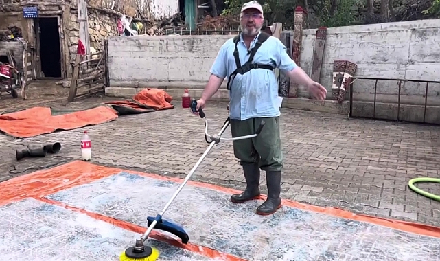 Tozunu alıp suyla ıslayarak temizleyici döktükleri halının üstünde tırpanın korumalığı sayesinde su sıçratmadan ot biçer gibi manevra yaptıklarını anlatan Karakuş, "Halı yıkamada çığır açtık. Köyümüzün eskileri bu görüntüleri görseydi çok şaşırırdı" diye konuştu.