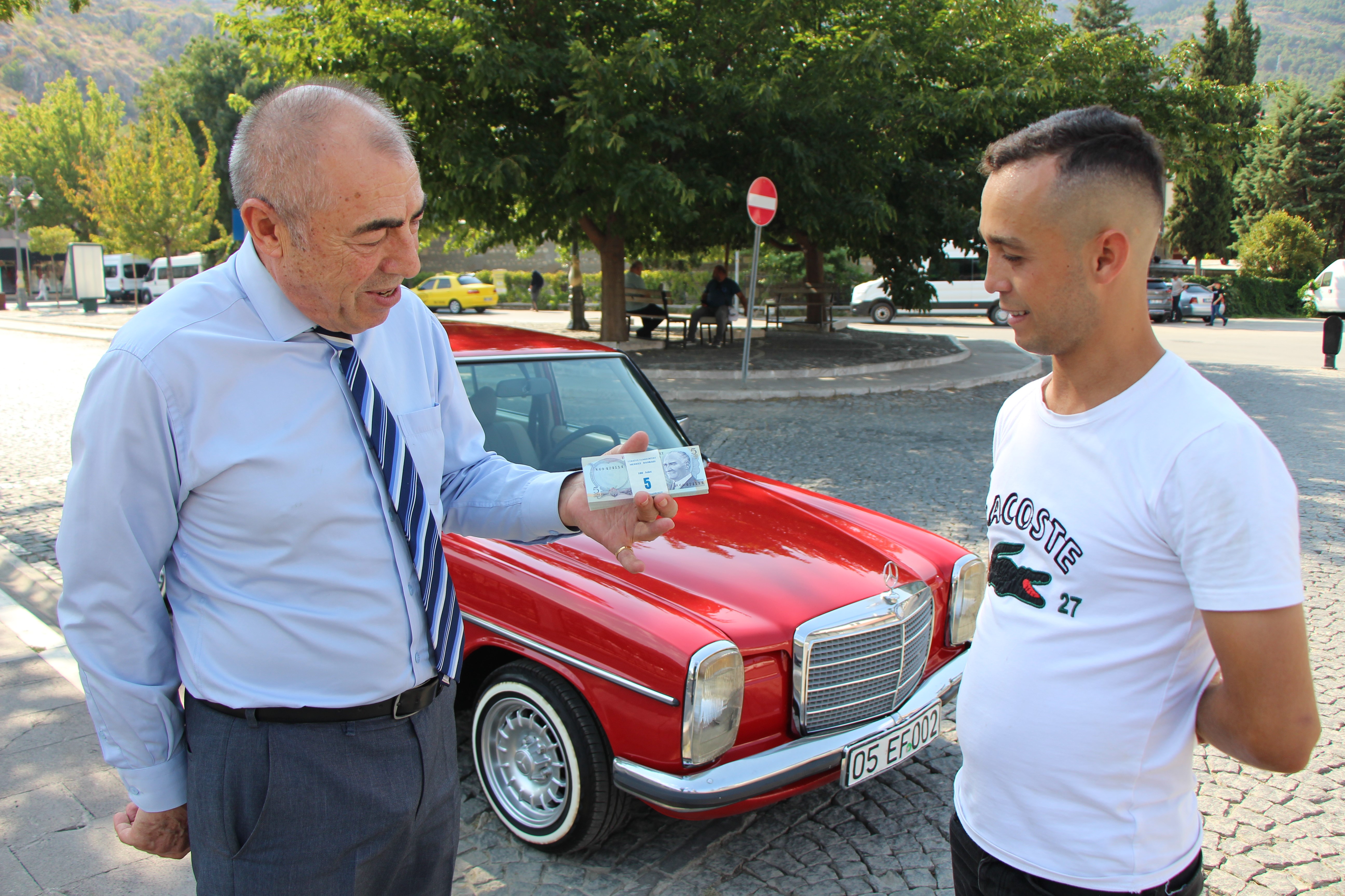 Otomobilin bütün parçalarını yenilettiği anlatan Erdem, “İyi bir alıcı çıkarsa üstüne 1970’lerden kalma serisi bozulmamış bir deste Merkez Bankası bandrollü eski 5’er liralardan vereceğim. Yani arabamı satacağım, üstüne de para vereceğim” diye konuştu.