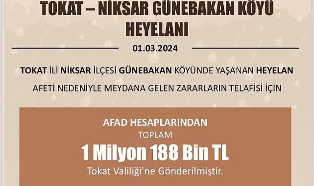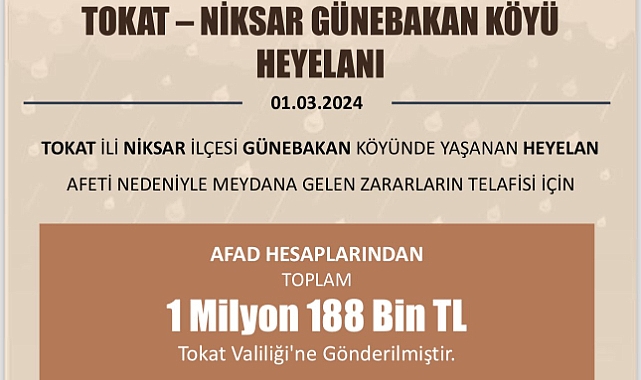 İçişleri Bakanı Ali Yerlikaya, sosyal medya hesabından yaptığı açıklamada Niksar’ın Günebakan Köyünde meydana gelen heyelanı hatırlattı. Heyelanda 40 konut, 15 ahır, 7 samanlık, 7 depo, 4 iş yeri ve 1 caminin etkilendiğini belirten Yerlikaya, “Heyelanın yaşandığı bölge 16 Şubat tarihinde Genel Hayata Etkili Afet Bölgesi ilan edilmiş ve 40 konut tedbir amaçlı boşaltılmıştı.Konutları zarar gören vatandaşlarımızın acil ihtiyaçlarının giderilmesi amacıyla AFAD Başkanlığınca Tokat Valiliğine 1 Milyon 188 Bin TL Acil Yardım Ödeneği gönderilmiştir. Heyelandan konutları etkilenen afetzedelerle ilgili hak sahipliği ve yer seçim çalışmaları devam etmekte. Hak sahipliği çalışmaları tamamlandıktan sonra en kısa zamanda konutlar vatandaşlarımıza teslim edilecek.