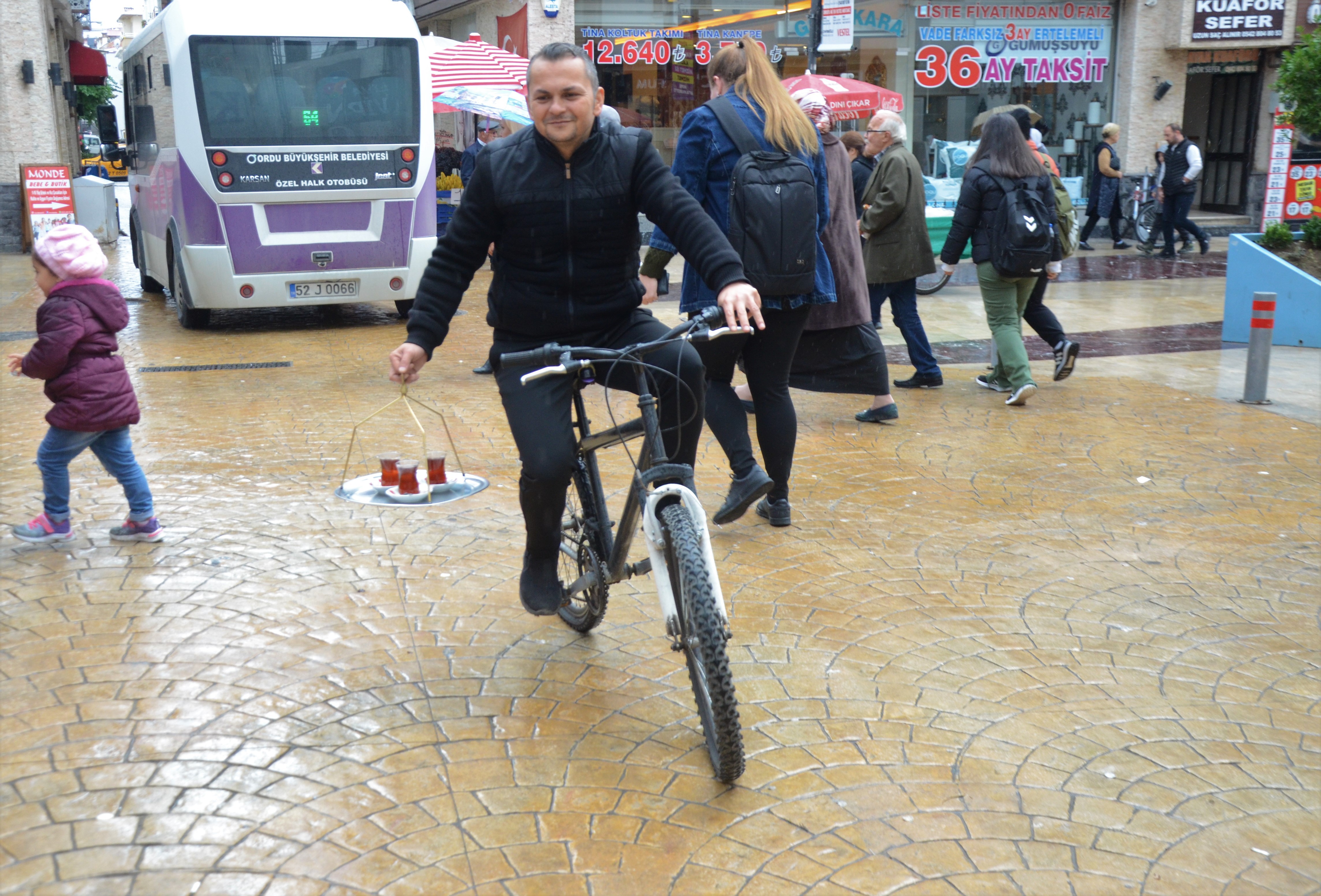 Ordu'da bir çay ocağı işletmecisi, hızlı olsun diye siparişlerini bisiklet ile yapıyor.