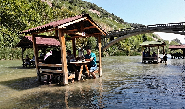 Tokat'ta bunaltan sıcaklarda suyun içerisinde kurulan kamelyada yemek yiyenler hem serinliyor hem de doğa manzarasının keyfini çıkartıyor.