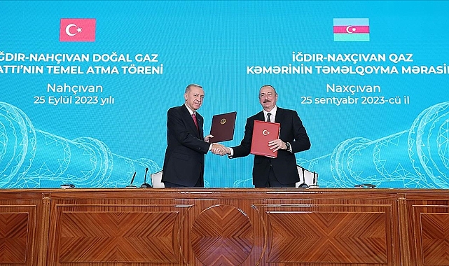 Azerbaycan Cumhurbaşkanı İlham Aliyev, Iğdır-Nahçıvan Doğal Gaz Boru Hattı'nın temelinin atılması ve iki ülke arasında çeşitli alanlarda gerçekleşen anlaşmaların imzalanmasının ardından ortak basın toplantısı düzenledi.Erdoğan, Cumhurbaşkanı seçiminin ardından ilk ziyaretini Kuzey Kıbrıs Türk Cumhuriyeti'yle birlikte haziran ayında Bakü'ye gerçekleştirdiğini hatırlatarak, bu defa da Türkiye'yi Türk dünyasına bağlayan Nahçıvan'da birlikte olmaktan büyük bir memnuniyet duyduğunu söyledi.Erdoğan, 2008 yılındaki son ziyaretinden bu yana Nahçıvan'ın kaydettiği gelişmeyi gururla müşahede ettiğini anlatarak, Nahçıvan'ın bugün geldiği noktada büyük payı olan Azerbaycan'ın Umummilli Lideri Haydar Aliyev'i doğumunun 100. yılında bir kez daha rahmetle yad ettiğini belirtti.Türkiye ve Azerbaycan ilişkilerinin dünyada eşi benzeri bulunmayan müstesna bir konumda olduğuna işaret eden Erdoğan, "tek millet iki devlet" şiarı çerçevesinde ilişkileri ve işbirliğini her alanda güçlendirmek üzere çalışmaları sürdürdüklerini ifade etti.Cumhurbaşkanı Erdoğan, Aliyev'le imzaladıkları Şuşa Beyannamesi'nin ilişkileri müttefiklik seviyesine yükselten bir dönüm noktası olduğunu dile getirerek, Nahçıvan'ın tarih boyunca taşıdığı stratejik önemle Azerbaycan'la ilişkilerde özel bir yere sahip olduğunu söyledi.
