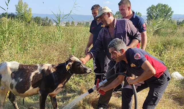 Erbaa'da balçığa saplanan ineği itfaiye ekipleri kurtardı