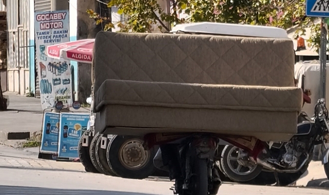 Tokat'ın Erbaa ilçesinde motosikletiyle koltuk taşıyan sürücüye ceza yazılarken aracı trafikten men edildi.