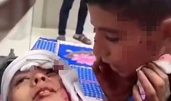 Gazze'de Filistinli bir çocuk, İsrail'in hastaneye düzenlediği saldırıda yaralanan kardeşine kelime-i şehadet getirmeye çalıştığı anlar yürek sızlattı.