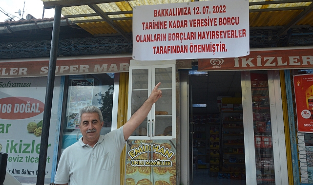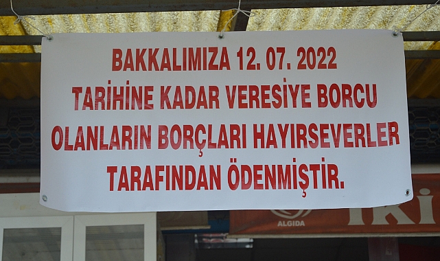 Tokat’ın Niksar ilçesinde bir hayırsever rastgele girdiği bir markette veresiye defterindeki tüm borçları ödedi. Veresiye defterindeki 20 bin liraya yakın borcu ödeyen hayırsever, markete borcu olan ailelerin yüzünü güldürdü. İsmetpaşa Mahallesinde market işleten Erol Ersin, iş yerine “Bakkalımıza 12.07.2022 tarihine kadar veresiye borcu olanların borçları hayırseverler tarafından ödenmiştir” yazılı afişi astı. Veresiye borcu olanlar ise afişi gördüklerinde mutlu oldu.