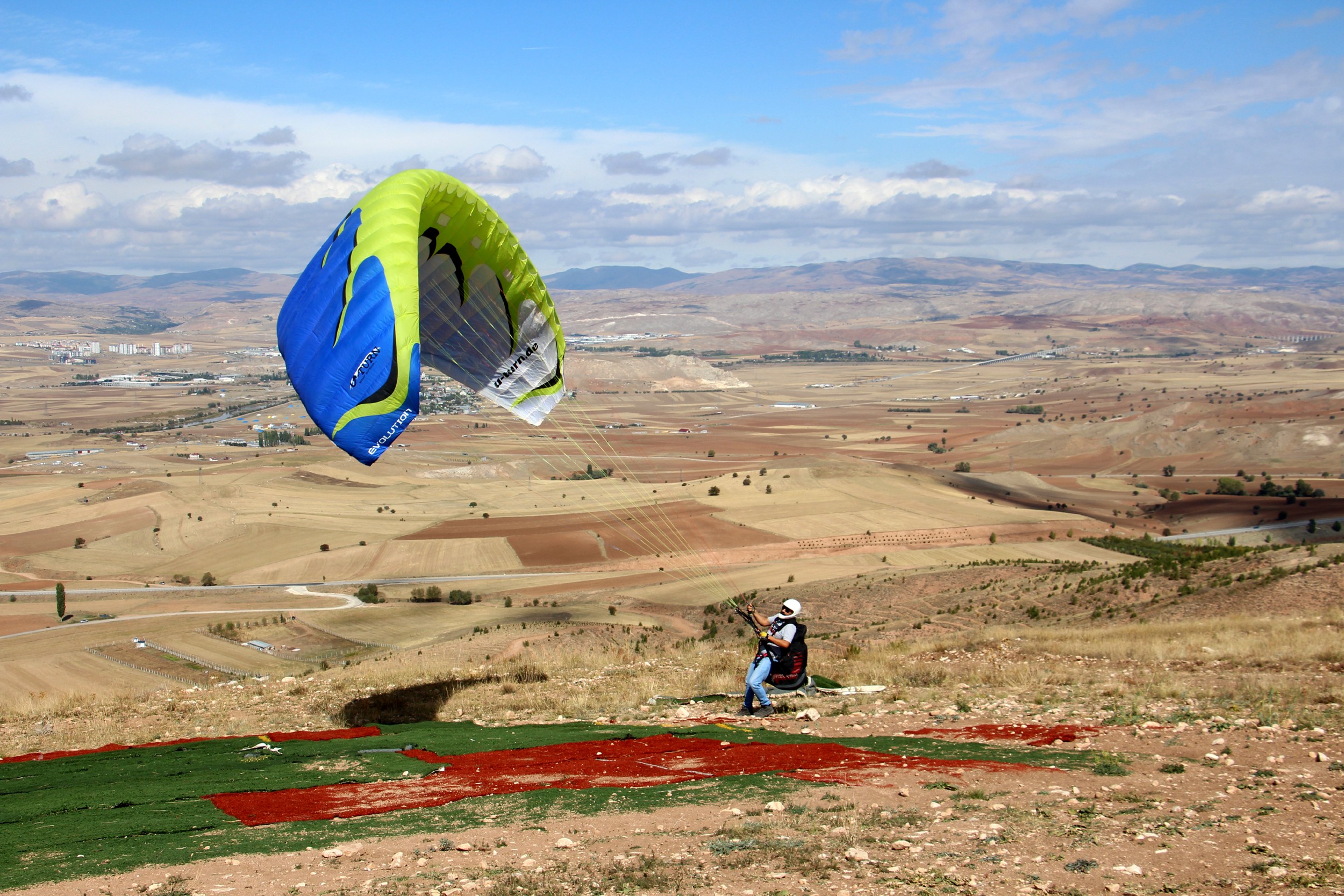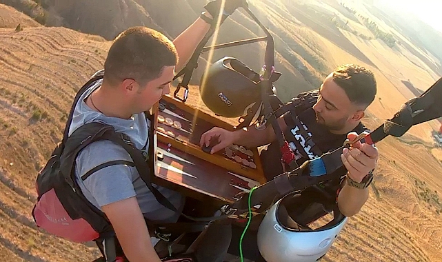 Sivas’ta yamaç paraşütü sporuyla uğraşan iki kafadar, metrelerce yükseklikten uçarak tavla oynadılar.