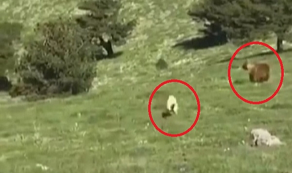 Tokat'ın Almus ilçesinde yaylada koyun sürüsüne yaklaşan ayıyı, Kangal köpeği uzaklaştırdı.