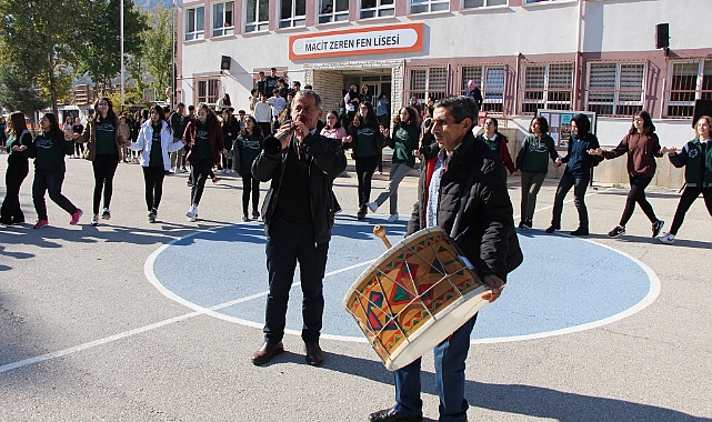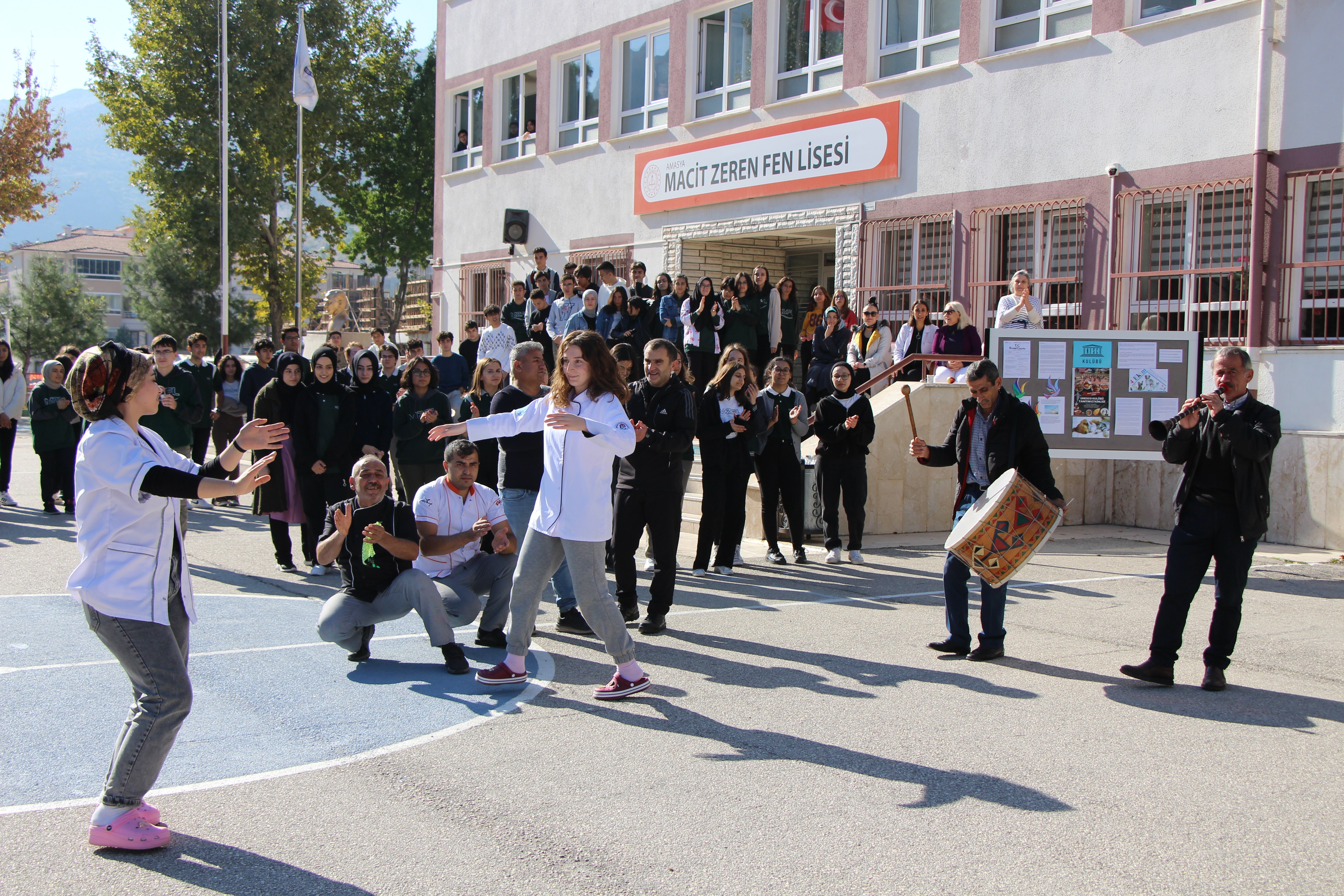 Amasya’da Macit Zeren Fen Lisesi öğrencileri, sonbaharda pastırma sıcaklarını fırsat bilip okul bahçesinde davulu-zurnalı halay keyfi yaptı. Şehre özgü yöresel yemeklerin ikram edildiği eğlenceye okul öğretmenleri de eşlik etti.Okulun UNESCO kulübü, şehrin coğrafi işaretlini yemeklerini bu yıl aralarına katılan öğrencilerine tanıtmak amacıyla etkinlik düzenledi. Baklalı dolma, keşkek, Amasya çöreği ve misket elması yiyen öğrenciler ardından davul-zurna eşliğinde oynayıp halay çektiler. Öğretmenler de coşkuya ortak oldu.