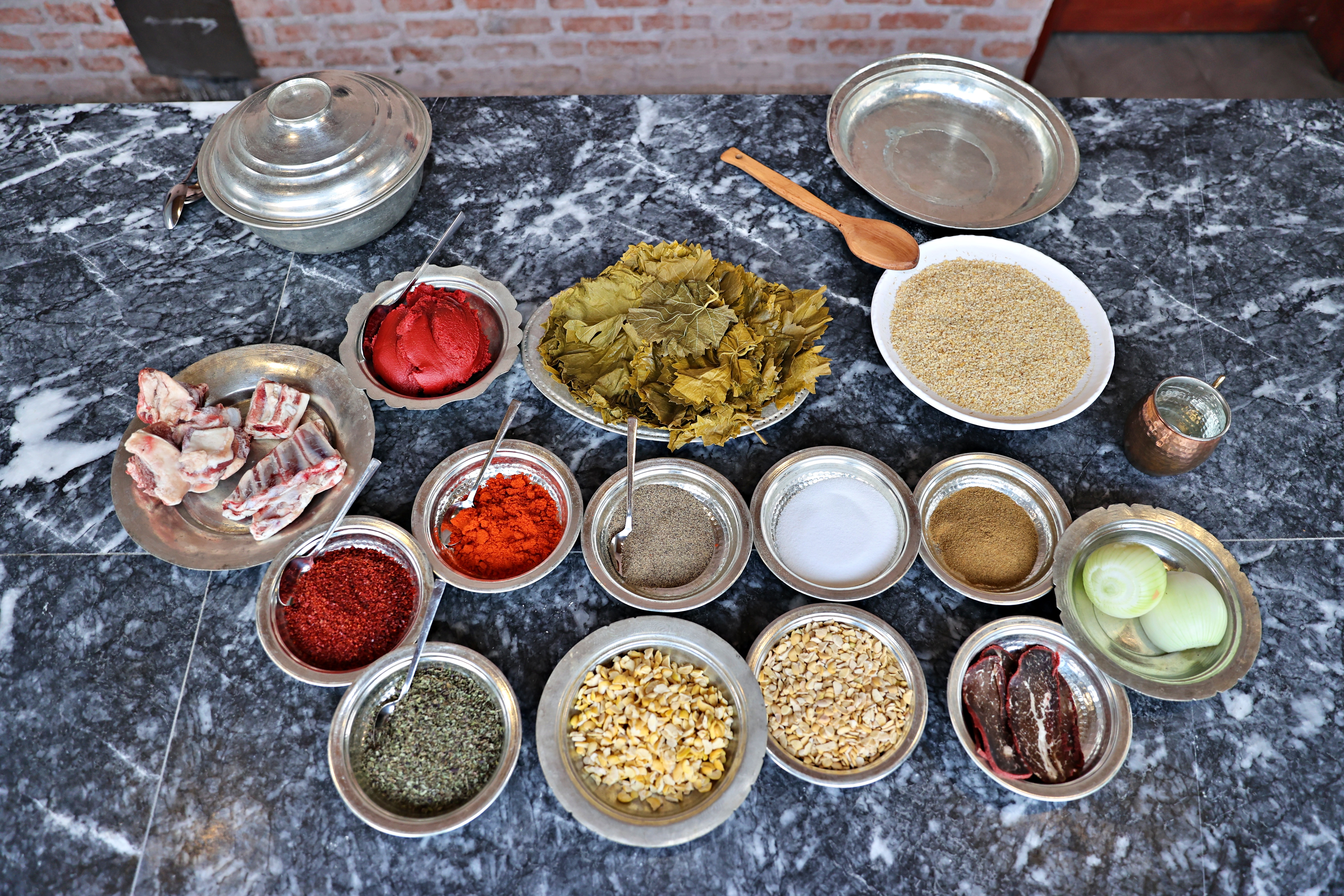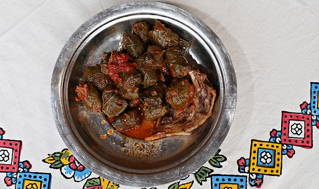 Yapılışı1. İç harcı için yarma ve bulgur karışımı bir kaba alınıp üzerine tuzla ovulup yıkanan kuru soğan eklenir.2. Salça, pul biber, karabiber, kimyon ve kuru mor reyhan karışıma ilave edilip biraz su eklenerek karıştırılır.3. Asma yaprağına pastırma dilimi konur, üzerine hazırlanan iç harçtan eklenir, ardından yaprak bohça şeklinde kapatılarak sarılır.4. Bakır bir tencerenin tabanına kuzu kaburga kemikleri yerleştirilir.5. Üzerine sarılan dolmalar düzenli şekilde dizilir.6. Dolmaların üzerine su eklenerek pişmeye bırakılır.7. Diğer yanda ince kıyılmış soğan, tereyağı ve az miktarda sıvı yağ ile kavrulur, üzerine salça eklenerek sos hazırlanır.8. Kaynamakta olan dolmanın kapağı açılır ve hazırlanan yağlı salçalı sos üzerine gezdirilir.9. Suyu azalmışsa biraz daha su eklenerek pişirme işlemi tamamlanır, servis edilir.