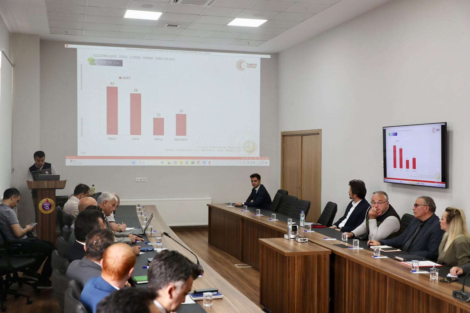 Toplantıda, Giresun Orman Bölge Müdürlüğü yetkilileri tarafından bir sunum yapılarak, Ordu, Ünye, Akkuş ve Mesudiye Orman İşletme Müdürlükleri bünyesinde yer alan yangın araçları, su kaynakları, son 10 yıl içerisinde Ordu ili genelinde çıkan orman yangınları ve çıkış sebepleri, orman yangınlarıyla mücadele ve orman yangını söndürme gönüllüleri hakkında Vali Muammer Erol ve komisyon üyelerine bilgilendirmede bulunuldu.