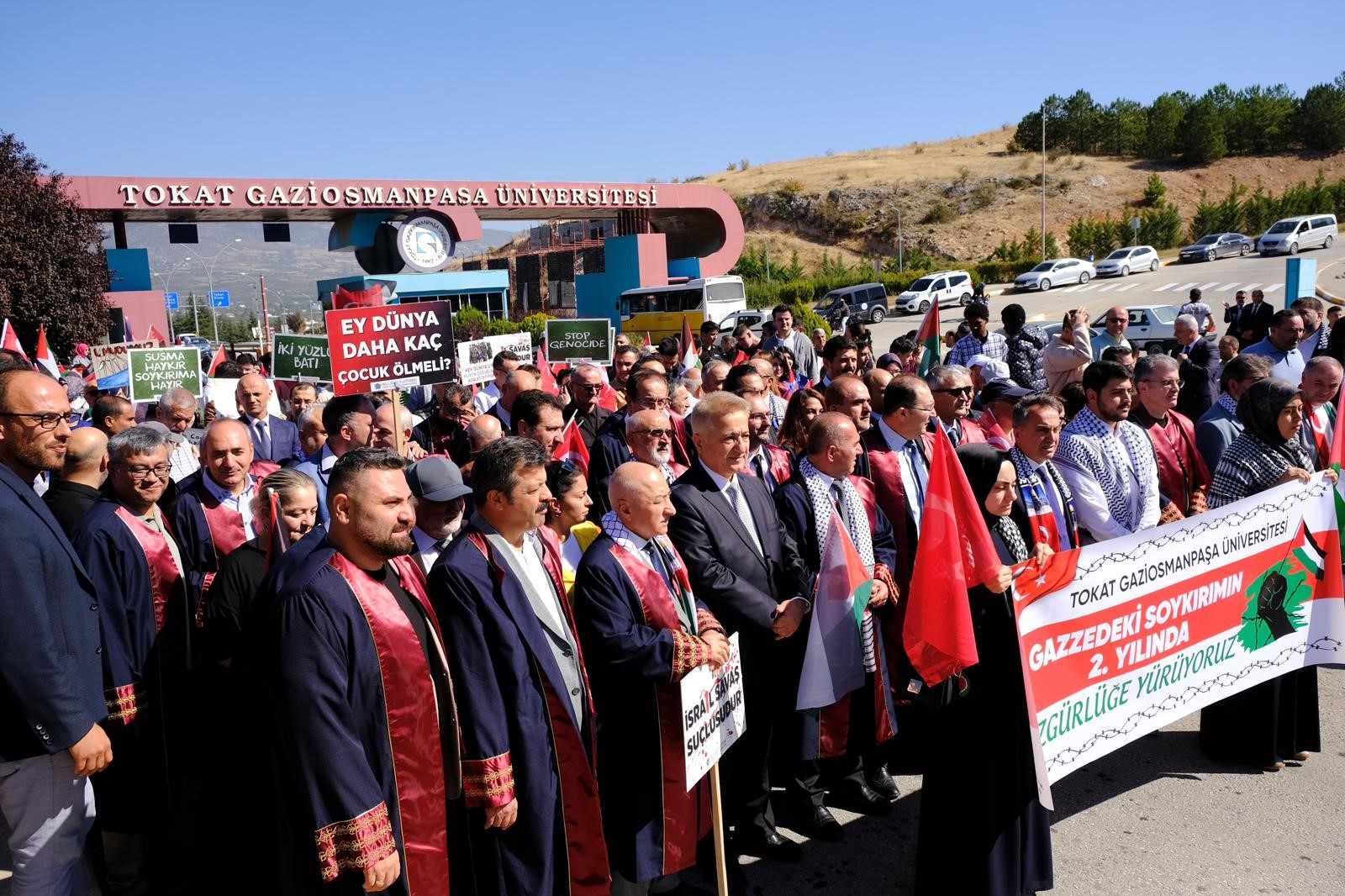 Tokat Gaziosmanpaşa Üniversitesi öğrencileri ve akademisyenleri, Gazze'deki soykırımın 2'nci yılı dolayısıyla "Özgürlüğe yürüyoruz" sloganıyla düzenlenen yürüyüşte barış, adalet ve özgürlük çağrısında bulundu.