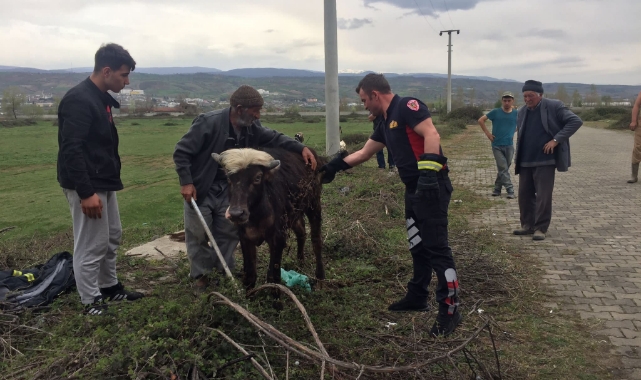 Tokat’ın Erbaa ilçesinde rögara düşen manda yavrusunu itfaiye ekipleri kurtardı.