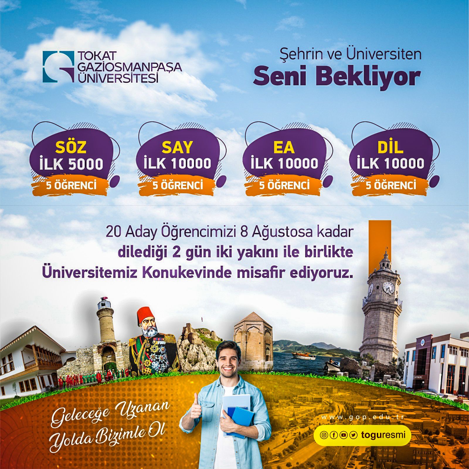 Tarihi ve doğal güzellikleri ile Anadolu’nun kadim kenti Tokat’ta bulunan Tokat Gaziosmanpaşa Üniversitesi (TOGÜ) 2023 Yükseköğretim Kurumları Sınavı (YKS) sonuçlarına göre başarılı olan 20 öğrenciyi 2 yakını ile birlikte Tokat’ta ağırlayacak.