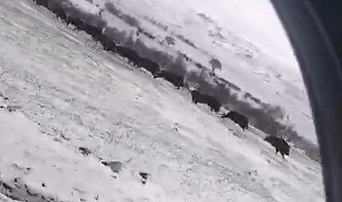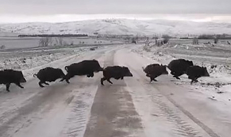 Tokat’ta etkili olan kar yağışı nedeniyle yaban hayvanları yiyecek bulmakta zorlanıyor. Kızılcin köyünden kendi aracıyla Zile ilçesine giden Erkan Özkara, Yıldıztepe Barajı bölgesinde domuz sürüsünü gördü.Özkara, karlı bölgede toprak yolda ilerleyen domuz sürüsünü cep telefonu kamerası ile kayda aldı. Yiyecek aradıkları tahmin edilen sürü aracın önünde geçerek hızla uzaklaştı.