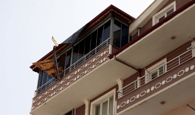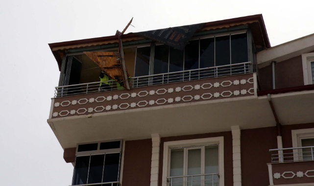 Tokat'ta rüzgarda çatıdan kopan parçayı balkona bağlayarak önlem aldılar