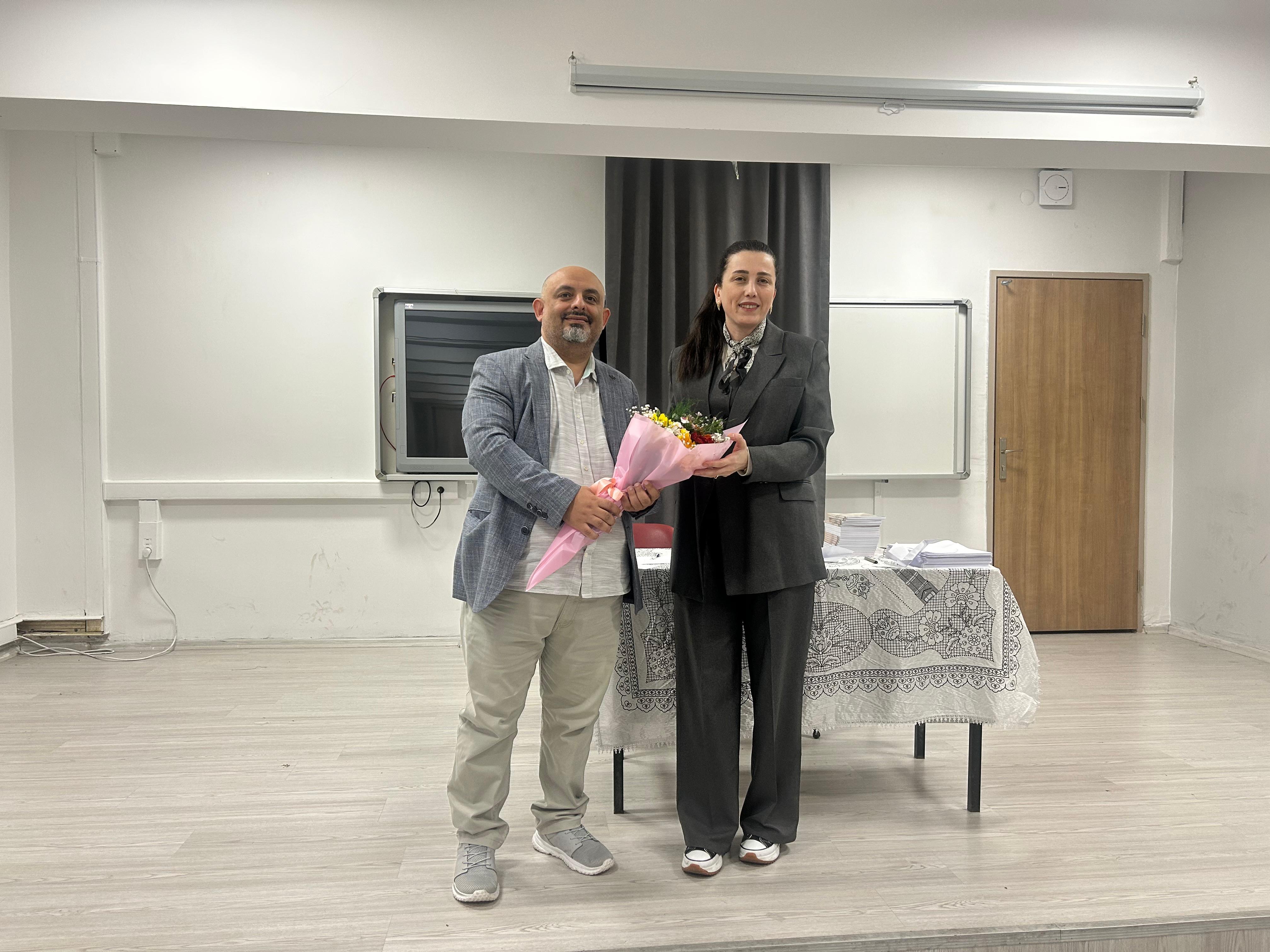 Origami sanatı eşliğinde düzenlenen etkinlikte masal kahramanı kuğu canlandırılırken, program sonunda Okul Müdürü Keziban Özcan, Mertol'a çiçek takdim etti.