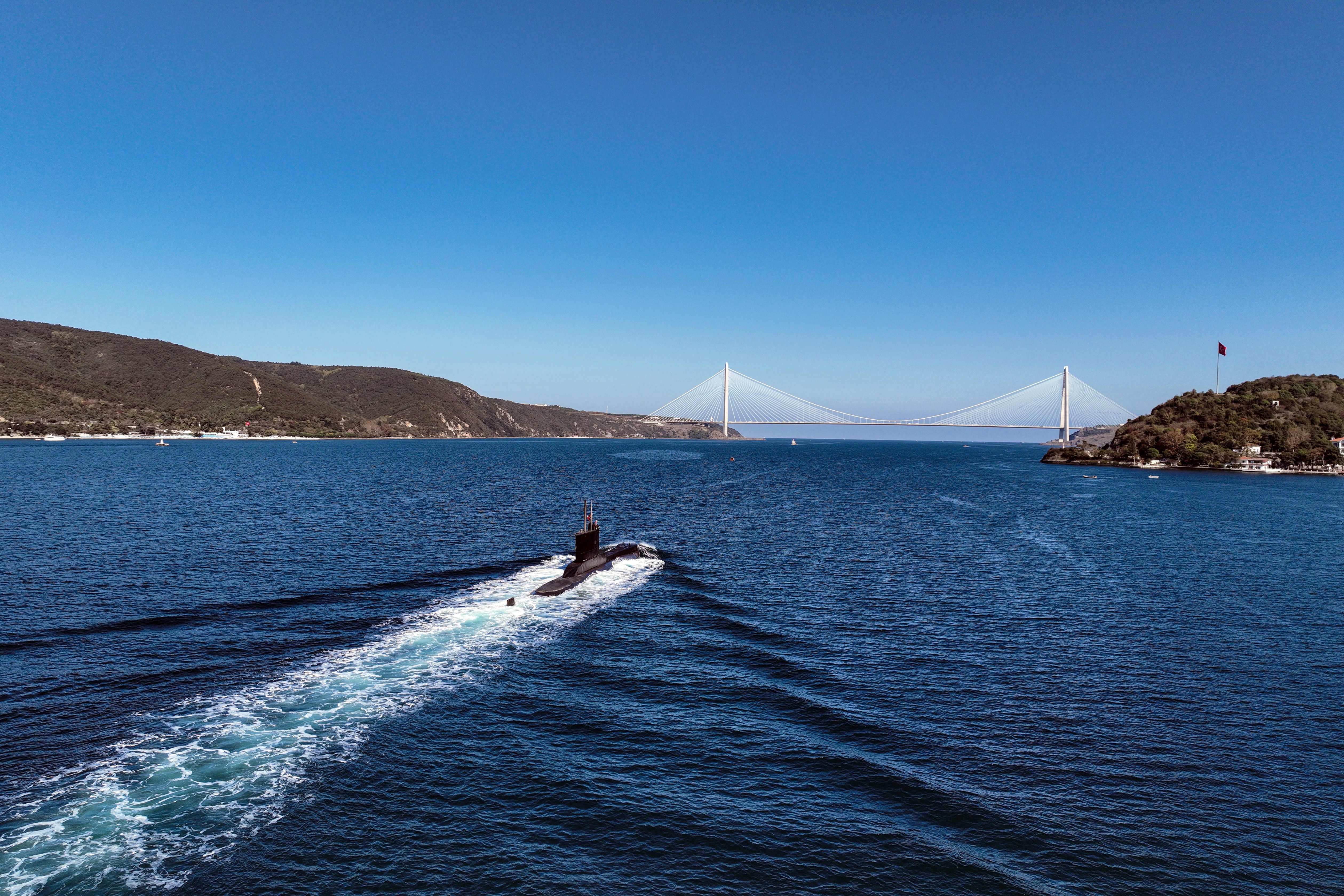 Marmara Denizi'nde seyreden Türk denizaltısı görevi için İstanbul Boğazı'ndan geçerek Karadeniz’e doğru yola çıktı. Mavi vatanın sessiz koruyucuları olarak bilinen Türk denizaltısının İstanbul Boğazı’ndan geçişi havadan görüntülendi. Tüm heybeti ile boğazda seyreden Türk denizaltısı eşsiz görüntüler oluşturdu.